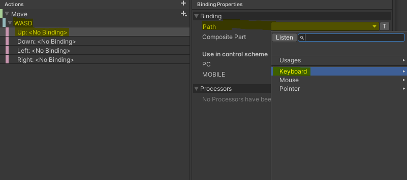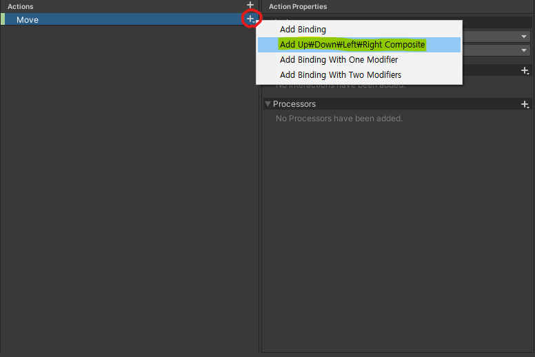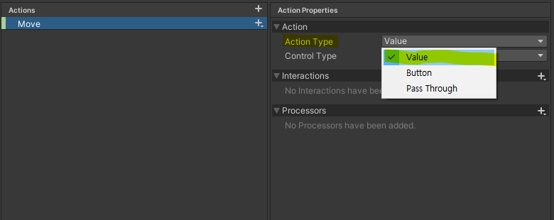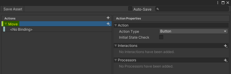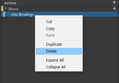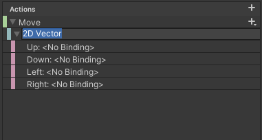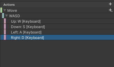 Actions는 해당 캐릭터의 어떤 액션에 사용될 키 입력을 받을 것인지에 대한 형태를 설정한다. 주인공 캐릭터의 액션 중 "이동(Move)"에 관한 내용으로 생성해봤다.