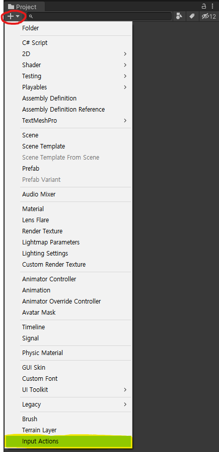 그러면 Unity를 다시 로드할 것이다. 다 되고 나서, Project 창에서 생성을 할 때 Input Actions 항목이 있다면 제대로 설치가 된 것이다.