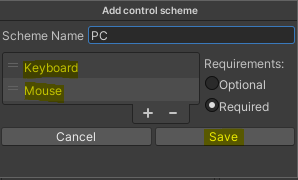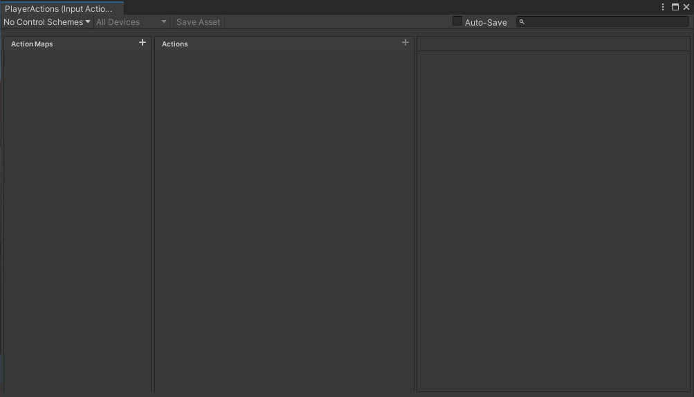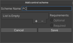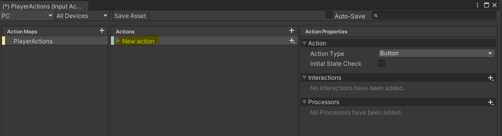 본인은 PC 플랫폼에서 주인공 캐릭터에 사용할 키 맵을 지정하기 위해, "PlayerActions"란 이름으로 하나 생성했다.