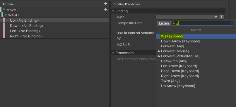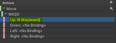 <No Biding>은 해당 키에 대응되는 키를 설정해주지 않았다는 뜻이다. 설정해주자. 먼저 WASD에 사용될 키부터 바인딩을 해주자. 이름을 "WASD"로 바꾸고, Up 키에 사용될 'W' 키를 적용해줬다.