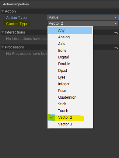 Control Type은 해당 키가 눌렸을 때, 스크립트에서 어떤 자료형 타입으로 리턴받아 사용할 지 정하는 옵션이다. X를 좌우로, Y를 Z 값에 사용하여 전진 후진으로 사용할 것이므로 Vector2를 선택해줬다. 캐릭터 이동에 WASD 또는 ↑←→↓를 사용할 것이기 때문에 키 바인딩을 4개 해야 한다.