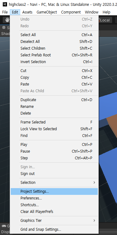 Unity Editor 상단 메뉴바 Edit → Project Settings → Player 탭