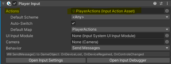 그리고 Player Input 컴포넌트의 Actions에 아까 만든 "PlayerActions" 파일을 넣어준다.